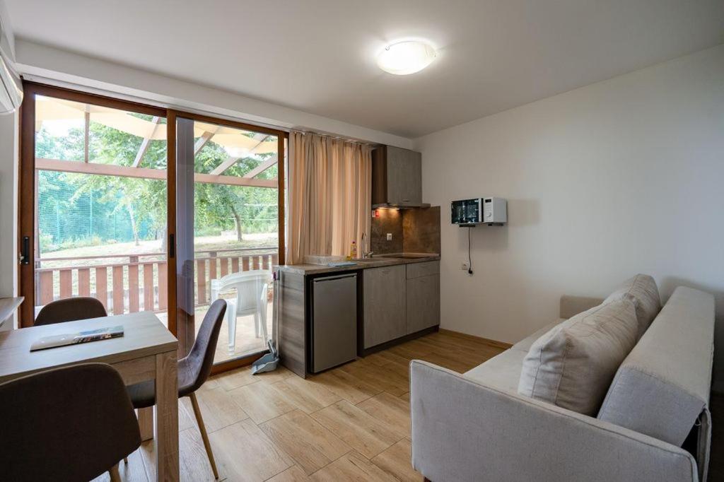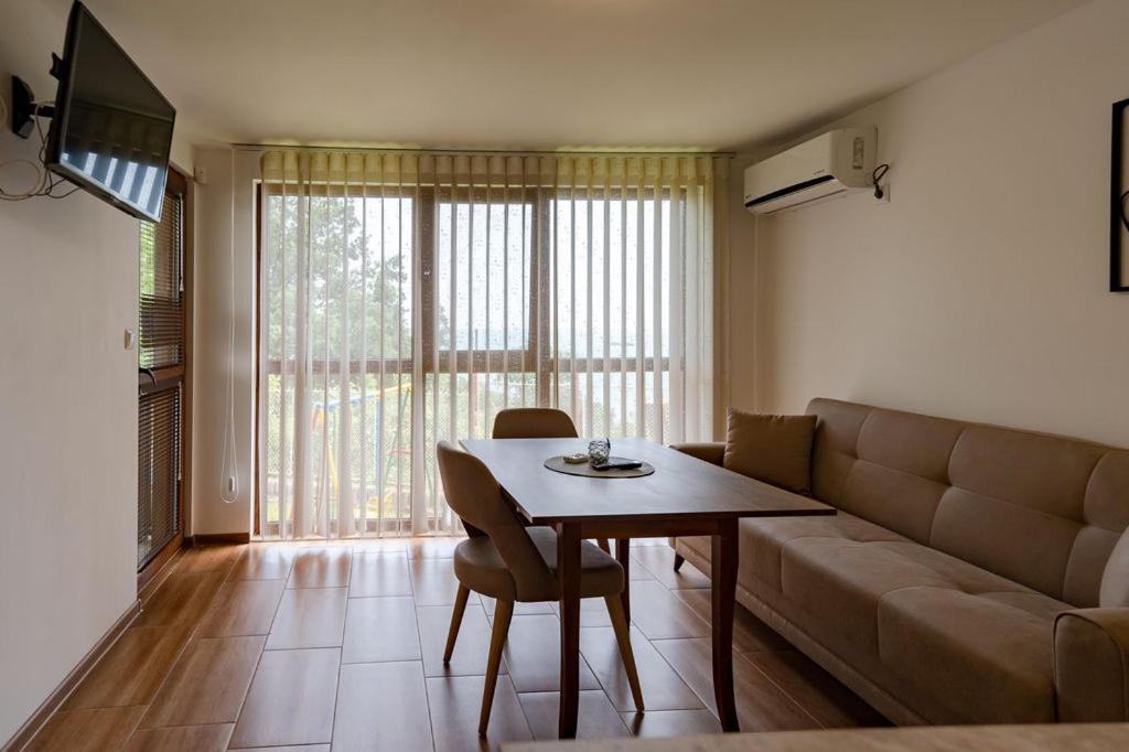 "Maybe because it was off season but you had no place to get a coffee or breakfast at walking distance until 10-11am, pool was not really clean, rooms had some cobwebs and others insects from the nature nearby I guess and most of the people there don’t really know any other language than Bulgarian."